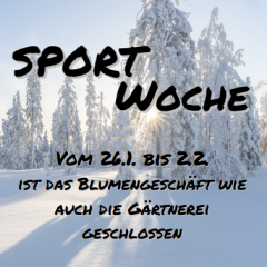 Liebe KundenVom 26.01.2026 bis am 02.02.2026 bleibt das Blumengeschäft, wie auch die Gärtnerei geschlossen.